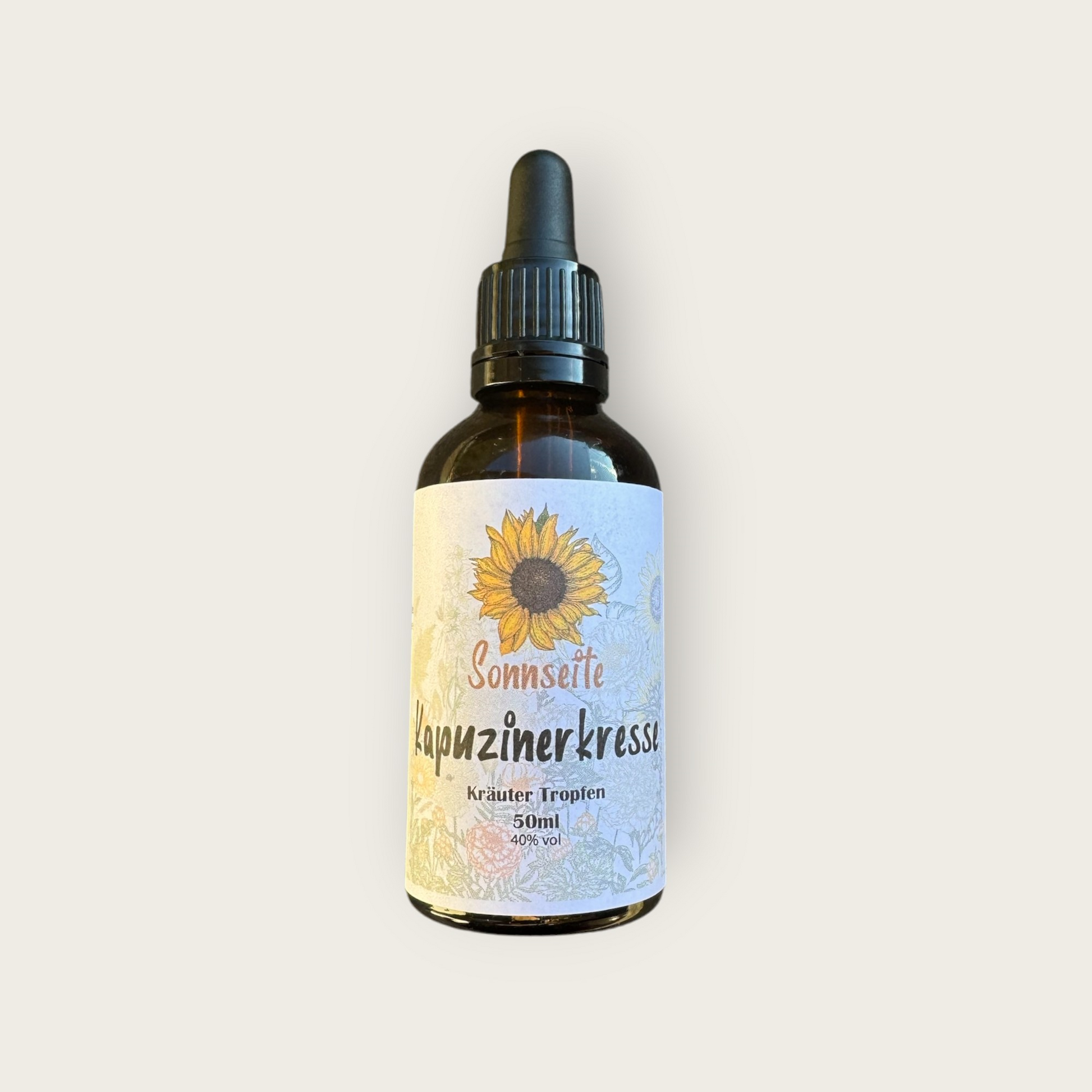 Unsere Kapuzinerkresse Kräutertropfen wird aus sorgfältig ausgewählten, frisch geernteten Pflanzen aus eigenem Anbau in unserem Kräutergarten in Tirol hergestellt. Durch die direkte Verarbeitung der frischen Pflanzen wird das volle Spektrum der natürlichen Inhaltsstoffe optimal erhalten, wodurch die wertvollen Wirkstoffe in besonders hoher Konzentration und Bioverfügbarkeit vorliegen. Die Tinktur bietet eine intensive Extraktion der aktiven Bestandteile, um höchste Reinheit und Wirksamkeit zu garantieren. Erlebe die Kraft der Natur in ihrer reinsten Form und unterstütze dein Wohlbefinden auf natürliche Weise.